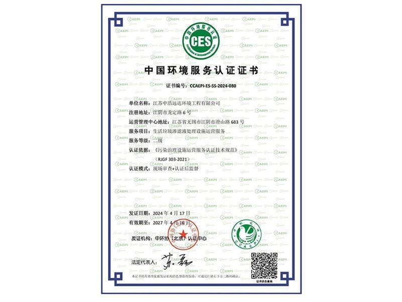 中国环境服务认证证书